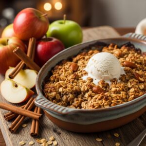A cozy dessert with warm spiced apples and a crunchy oat-almond topping.