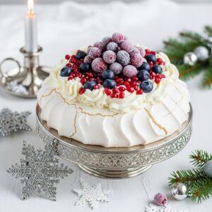 This elegant dessert features a crisp meringue shell with a marshmallow-like center, topped with whipped cream and fresh winter berries.