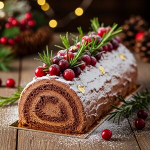 The sponge is made with almond or rice flour, filled with chocolate buttercream, and rolled into a festive log shape.