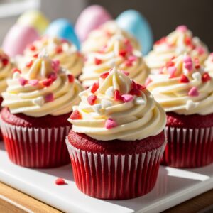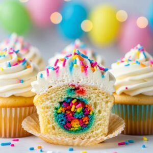Vanilla cupcakes filled with colorful sprinkles, perfect for birthdays or celebrations.