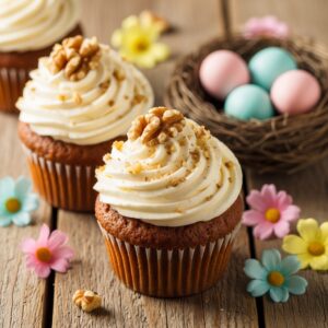 Moist and spiced cupcakes with shredded carrots, perfect for cream cheese frosting.