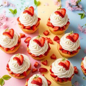 Sweet cupcakes filled with fresh strawberries and topped with whipped cream.