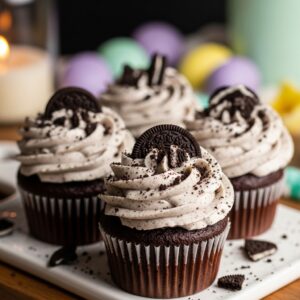 Chocolate cupcakes filled and topped with crushed chocolate sandwich cookies.