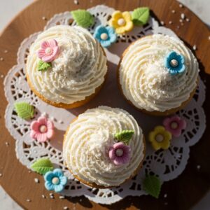 Soft cupcakes infused with coconut flavor, topped with coconut frosting and flakes.