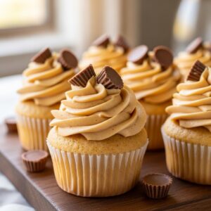 Fluffy cupcakes flavored with peanut butter, topped with creamy peanut butter frosting.