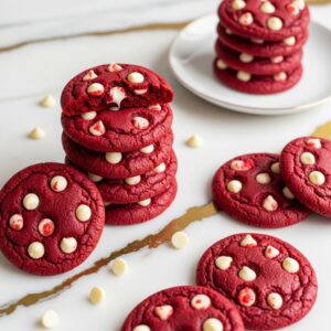 Soft red velvet cookies with white chocolate chips — elegant and delicious.