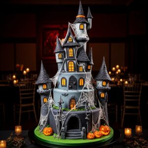 Turn your cake into a sculpted Halloween Town masterpiece with fondant towers, cobwebs, pumpkins, and glowing windows.