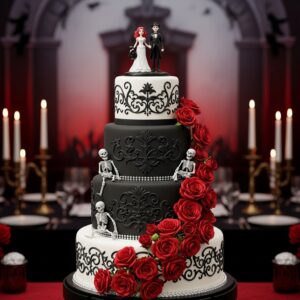 Decorate the tiers with black scrolls, skeleton motifs, and red sugar roses.
