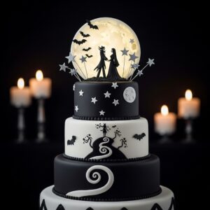 A classic choice for Tim Burton fans — a multi-tiered black-and-white cake featuring Jack and Sally’s silhouette standing on the Spiral Hill under a glowing fondant moon.