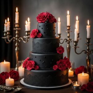 Add touches of deep red sugar roses and black pearls for a luxurious gothic look that feels both elegant and eerie.