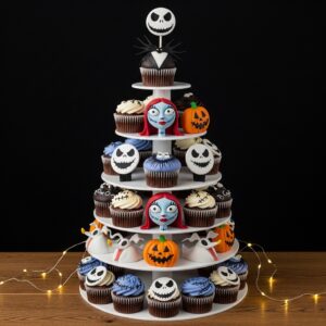 Instead of a traditional cake, go for a cupcake tower decorated in Nightmare Before Christmas themes — Jack faces, Sally’s stitches, pumpkins, and Zero.