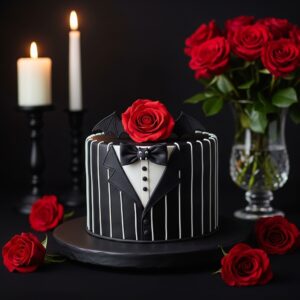 Pay homage to Jack’s pinstripe suit with sleek black fondant and thin white vertical stripes.