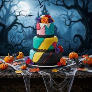 Inspired by Sally’s stitched dress, this cake features colorful fondant panels in pink, teal, yellow, and black, bordered by edible “stitches.”
