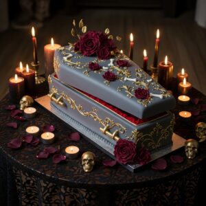 Decorate it with deep burgundy flowers, gold piping, and subtle bone motifs. It’s a daring and memorable statement piece.