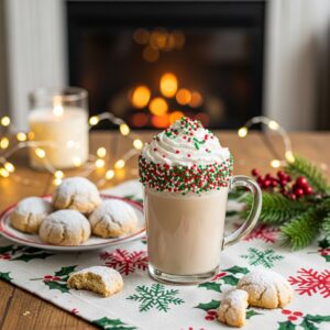 Topped with whipped cream and festive red and green sprinkles, this drink captures the essence of Christmas in every sip.