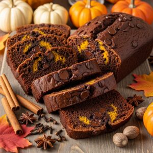 This rich quick bread blends cocoa, pumpkin puree, and warm spices for a moist and flavorful treat.