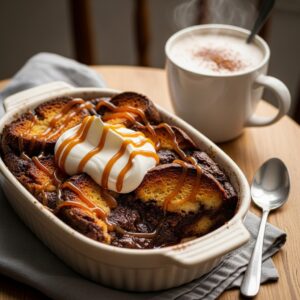 The bread soaks up a rich chocolate custard and bakes until gooey and soft. Serve warm with whipped cream or a drizzle of caramel sauce for pure comfort.