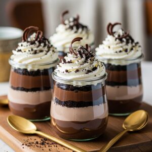 Layer creamy chocolate pudding with whipped cream and crushed cookies for a fun and elegant dessert.