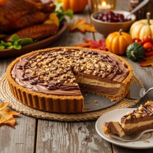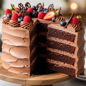 Frosted with creamy chocolate buttercream and decorated with chocolate shavings or berries, it’s an impressive centerpiece for Thanksgiving dessert tables.