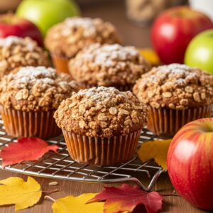 These tender muffins are filled with diced apples and topped with a crunchy streusel topping.