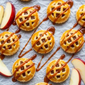 These adorable bite-sized cookies are filled with a gooey apple pie filling and wrapped in a buttery lattice crust.