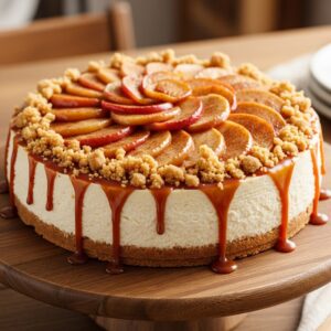 The smooth cheesecake texture pairs beautifully with the sweet, spiced apple topping, making it a standout dessert on any Thanksgiving table.