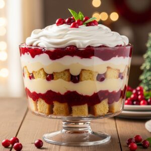 Combine layers of cranberry sauce, vanilla pudding, whipped cream, and cubes of pound cake in a large glass bowl.