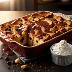 This rich dessert is made with cubed bread soaked in custard, baked, and drizzled with warm bourbon or caramel sauce.