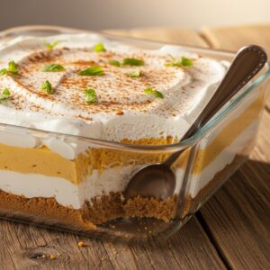Layers of graham cracker crust, pumpkin pudding, whipped cream, and cream cheese filling come together in a large dish.
