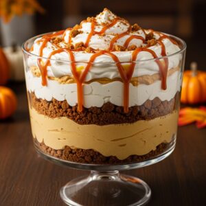 Layer crushed gingerbread cookies, pumpkin mousse, whipped cream, and caramel drizzle in a large trifle bowl.