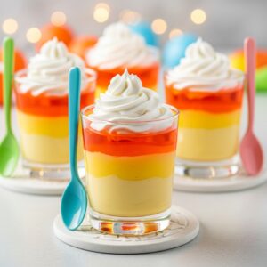 Layer vanilla pudding, orange Jell-O, and whipped cream in clear cups to create a candy corn effect.
