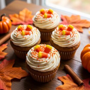 Top them with cream cheese frosting and orange sprinkles.