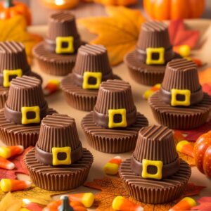 Make no-bake pilgrim hats using fudge-striped cookies and mini peanut butter cups.