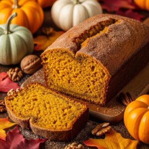 Ingredients: Pumpkin puree, flour, sugar, oil, eggs, baking soda, cinnamon, and nutmeg.
