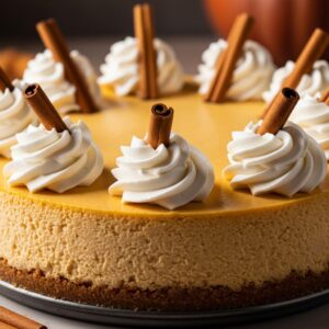 Ingredients: Cream cheese, pumpkin puree, sugar, eggs, graham cracker crust, cinnamon, and nutmeg.