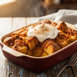 Made with cubed bread soaked in pumpkin custard, this dessert is rich, soft, and aromatic.