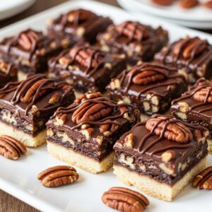 A twist on the classic pecan pie, these bars are rich with chocolate and buttery pecans layered on a shortbread crust.