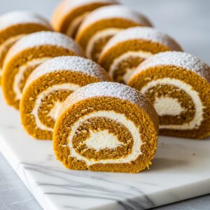 A soft pumpkin sponge cake rolled with sweet cream cheese filling makes a show-stopping dessert.
