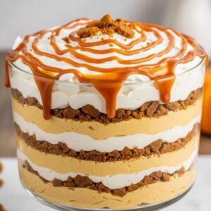 Layers of pumpkin mousse, whipped cream, and crushed gingersnaps come together in a stunning glass dish.