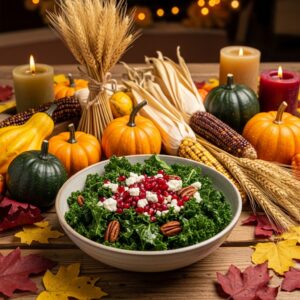 A vibrant salad with crunchy kale, juicy pomegranate seeds, and a light lemon dressing.