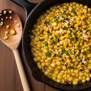Sweet corn kernels sautéed with vegan butter and garlic make a quick, flavorful side dish.