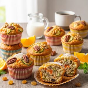 Nutritious breakfast muffins loaded with shredded zucchini, carrots, raisins, and nuts.