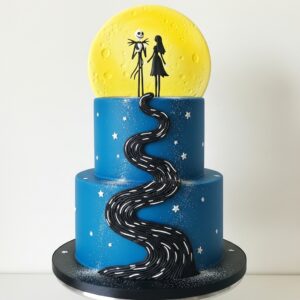Celebrate love, gothic-style! Create a two-tier cake with Jack and Sally figures standing together on the Spiral Hill under a glowing moon backdrop.