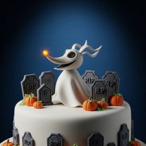 Make a cute ghostly cake using white fondant and add Zero’s orange candy nose.
