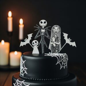 Go minimalist with black fondant and white detailing — silhouettes of Jack and Sally, cobweb patterns, and bats.
