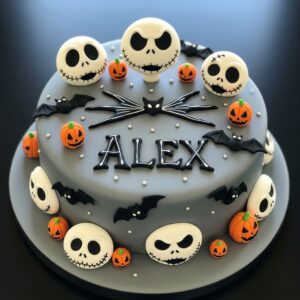 Finish your themed celebration with a personalized topper that includes the birthday person’s name in spooky Nightmare Before Christmas font, surrounded by bats, pumpkins, and stars.