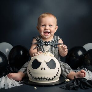 A Nightmare Before Christmas cake smash blends spooky creativity with adorable chaos — the perfect mix for memorable birthday moments or themed photoshoots.