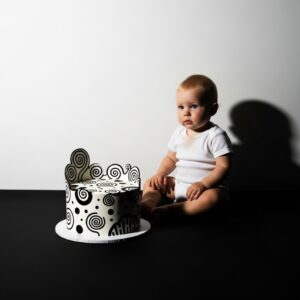 Surround the cake with small black balloons and white streamers for a striking monochrome setup that lets baby steal the show.