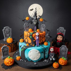 A spooky-yet-cute option featuring crushed Oreo “dirt,” cookie tombstones, and fondant pumpkins.