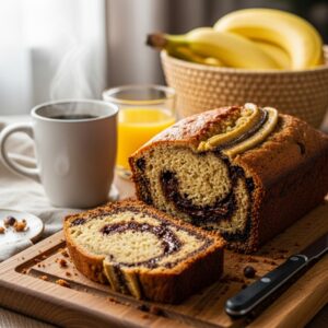 Moist banana bread with a sweet chocolate twist.